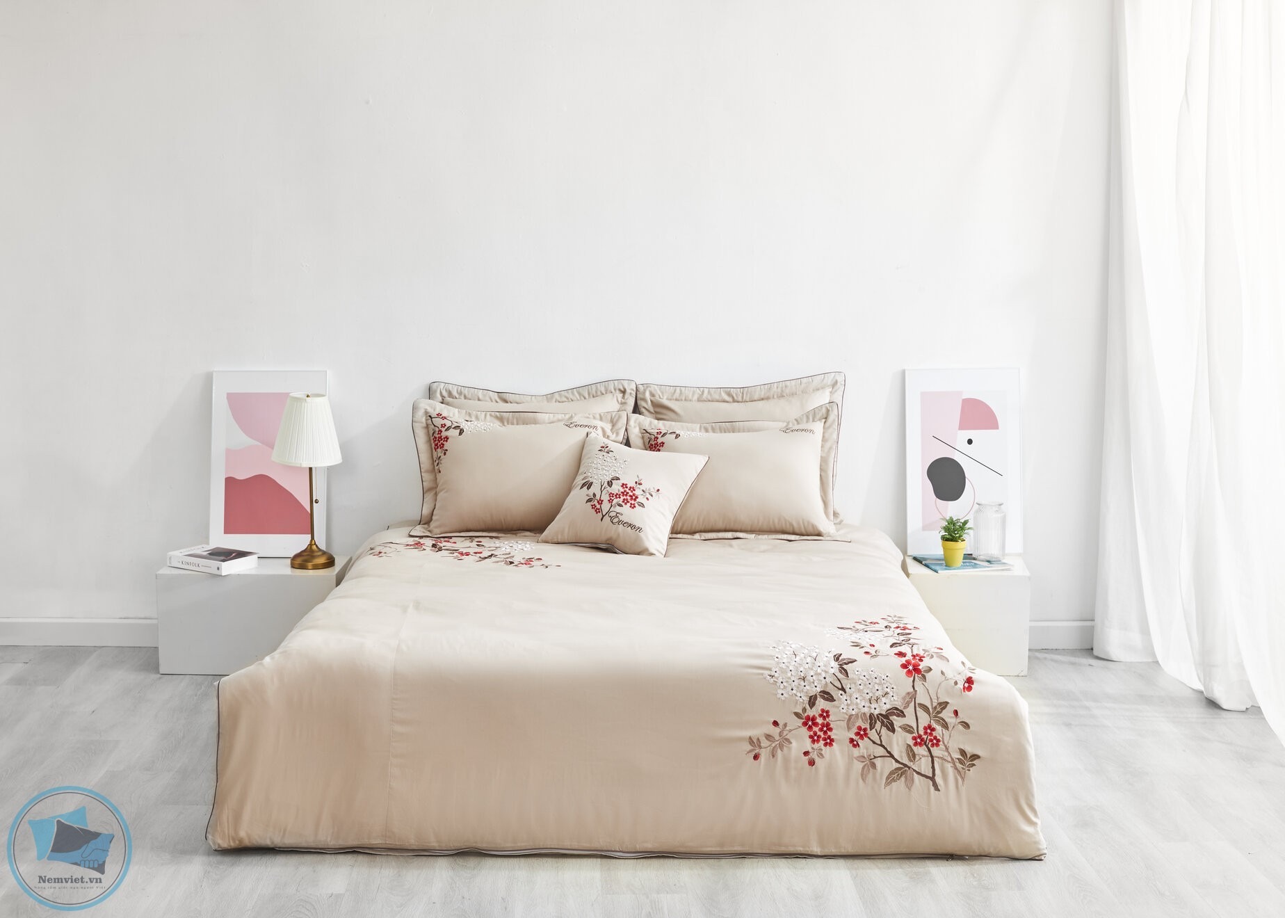 Bộ chăn ga ESM21013 là một tổng thể vô cùng trang nhã, nhẹ nhàng Những bông hoa đào đỏ nổi bật, bắt mắt kết hợp cùng những bông cẩm tú cầu trắng nhẹ dịu, trẻ trung. Tông màu chính của bộ chăn ga là màu be nhạt – màu sắc rất được ưa chuộng trong những năm gần đây.