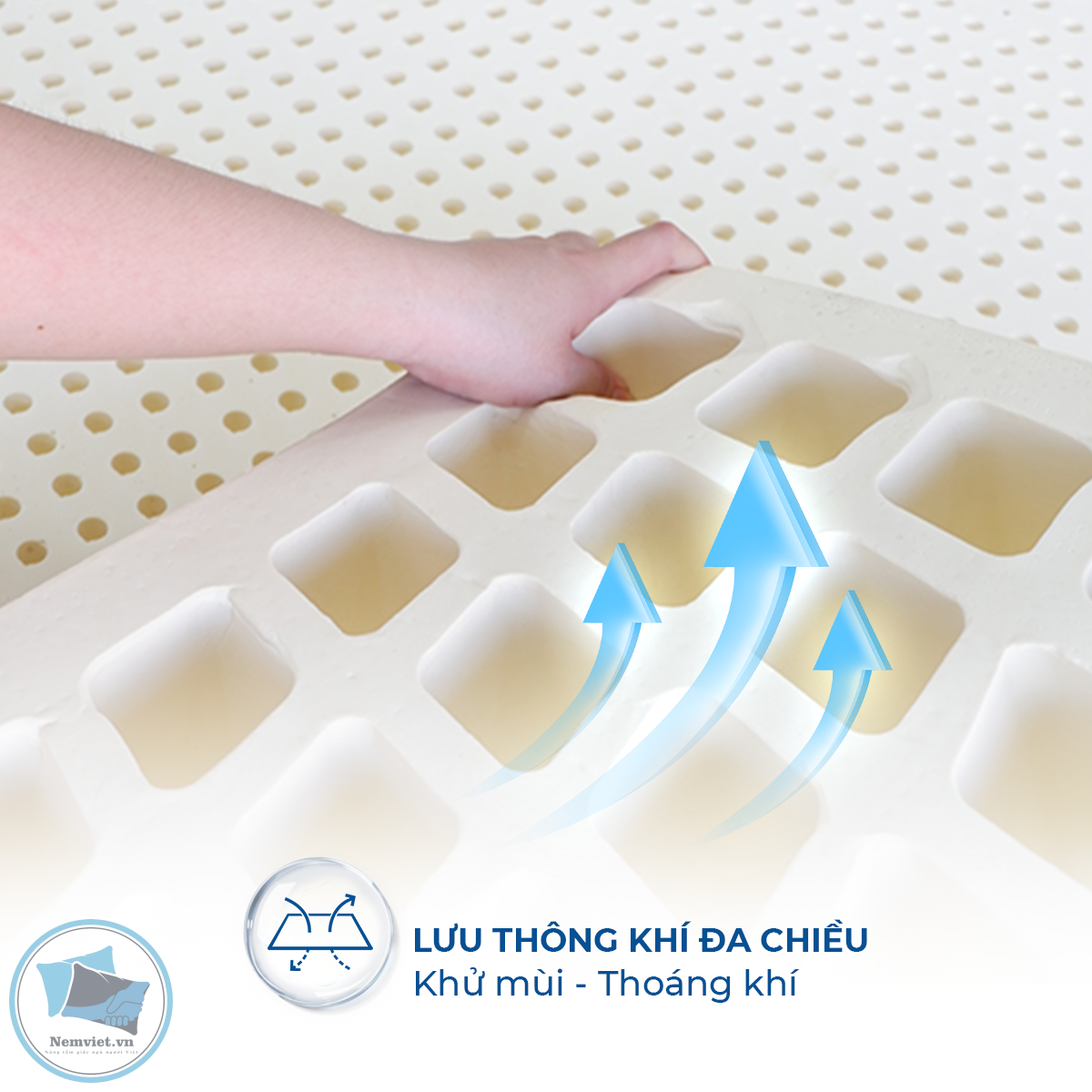 – Thoáng Khí Vượt Trội: Kết cấu Thành Nệm lỗ vuông dày cùng hàng ngàn lỗ thoáng khí siêu nhỏ giúp nệm thông thoáng hơn, hàng triệu lỗ thoáng khí từ sâu trong lõi nệm giúp tăng khả năng thoáng khí cao cấp hơn