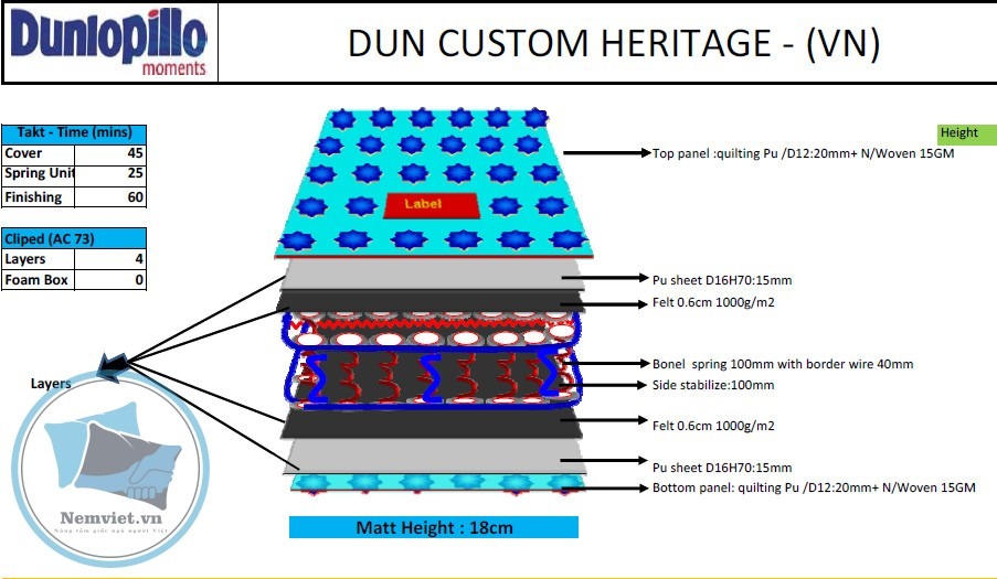 + Chiều cao tổng thể 18cm giúp Heritage rất dễ phù hợp với các thiết kế giường thông dụng.